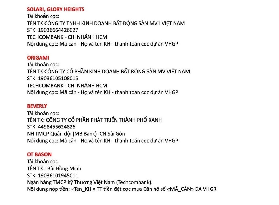 CẬP NHẬT SỐ TÀI KHOẢN DỰ ÁN VINHOME GRAND PARK